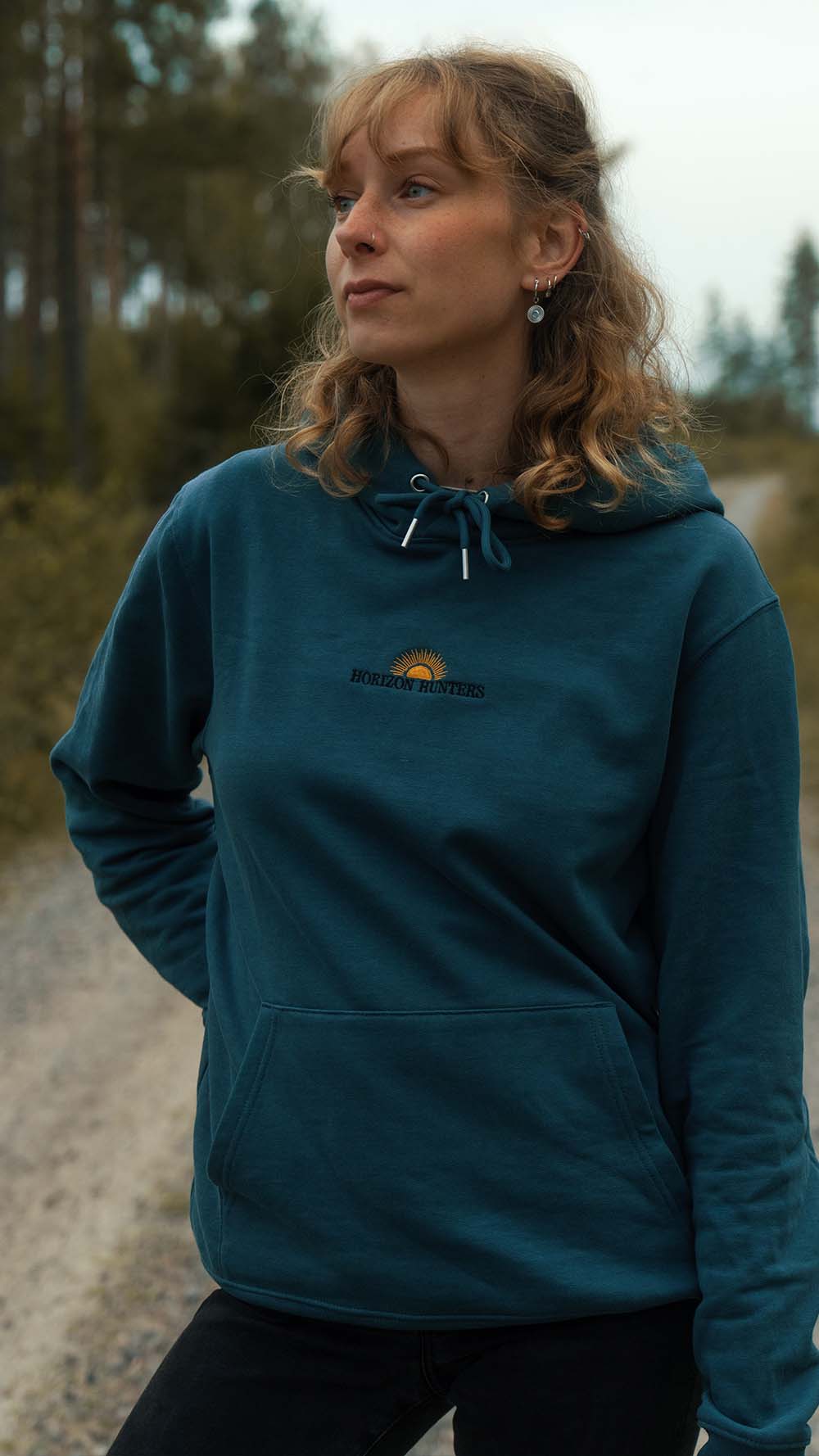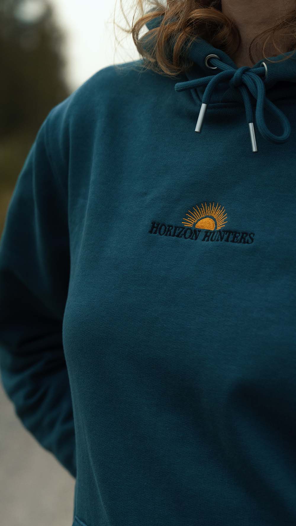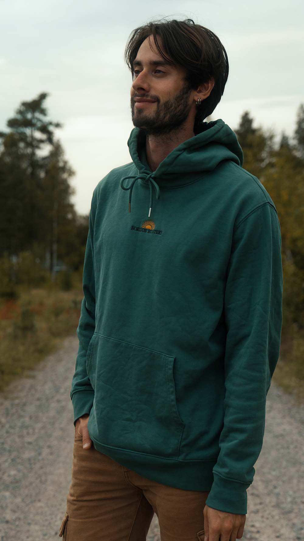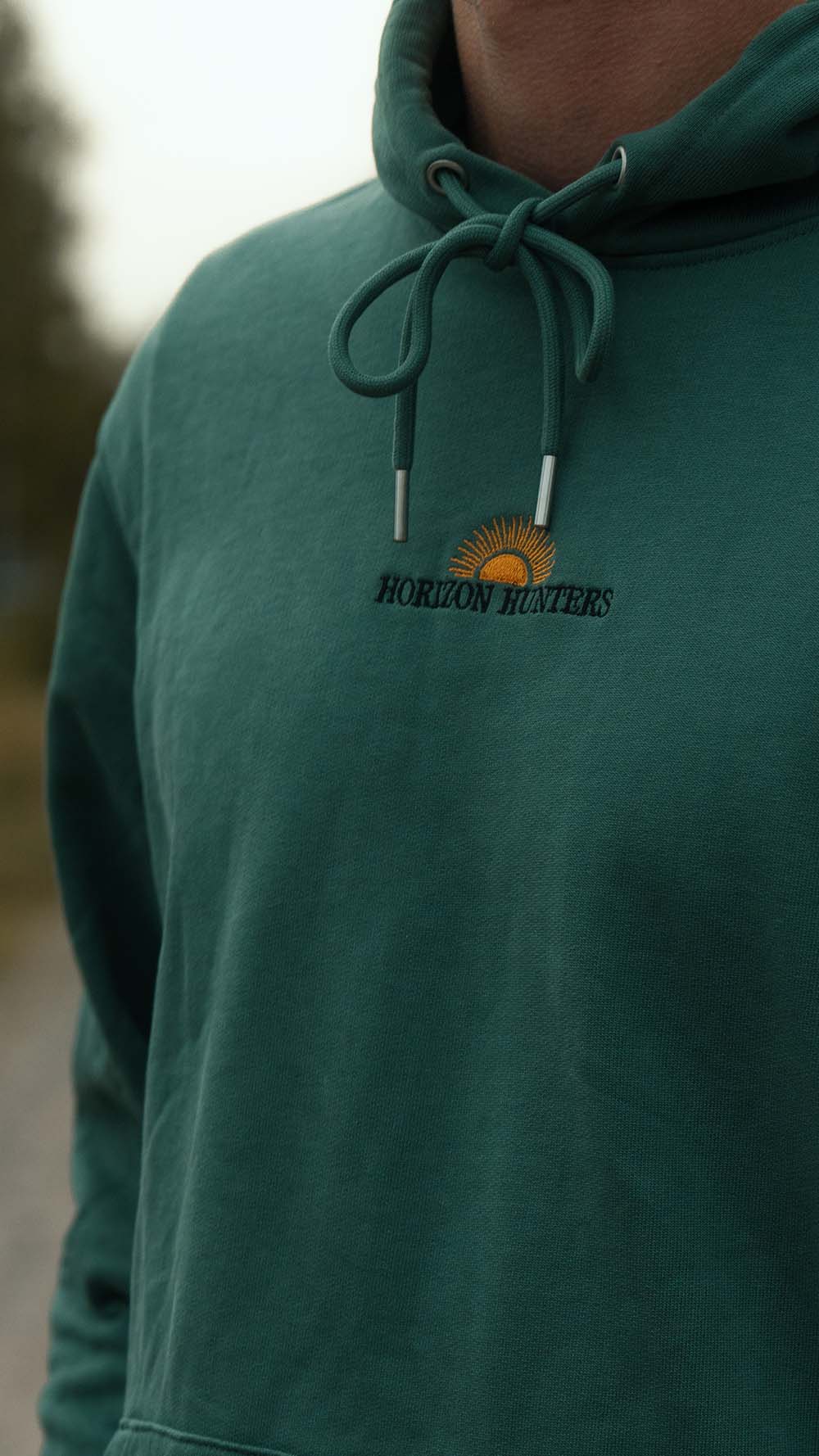 Hoodie in der Farbe "Latte", "Green Bay" und "Stargazer" mit der "Horizon Hunters" Stickerei vorne.
