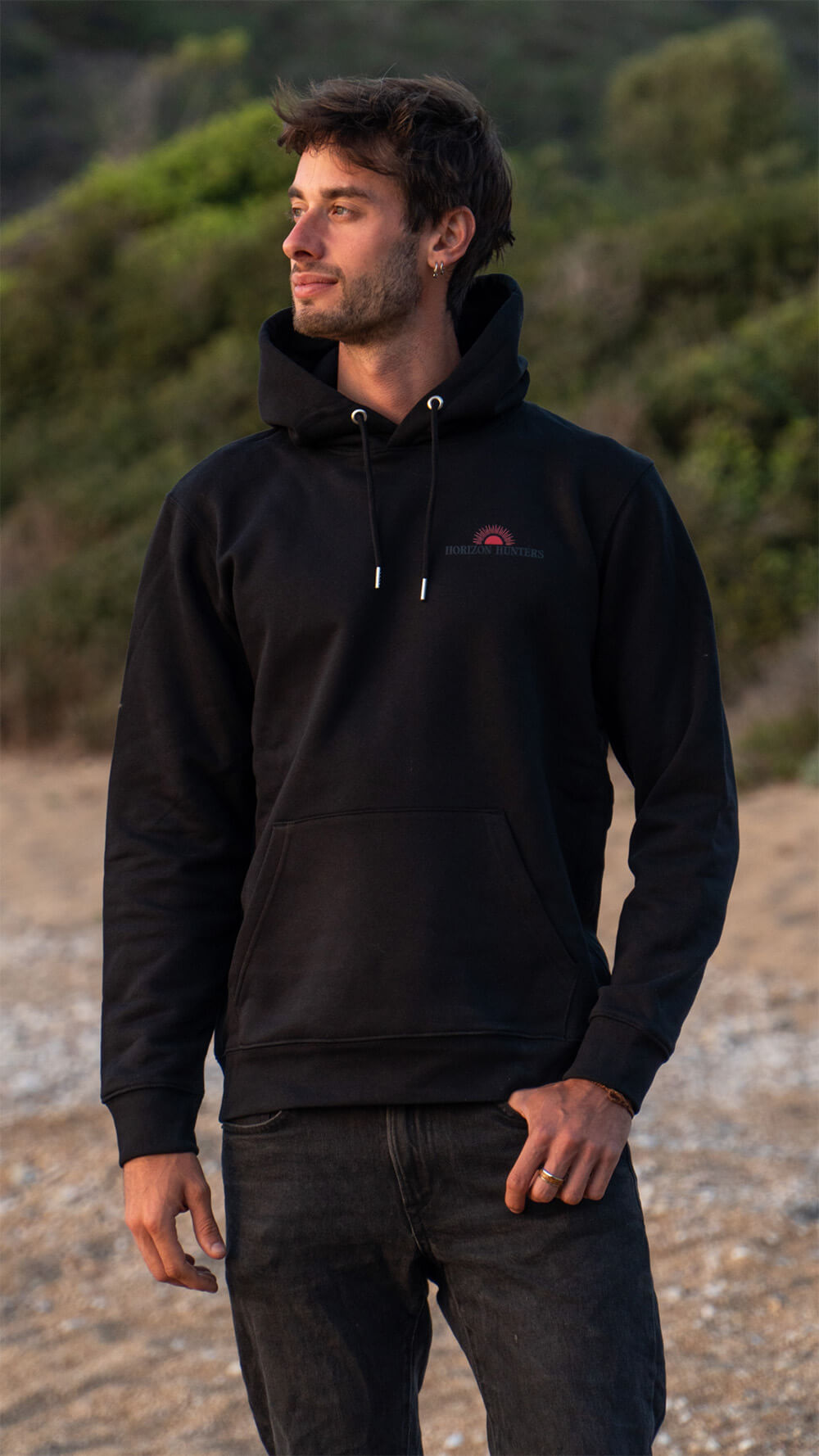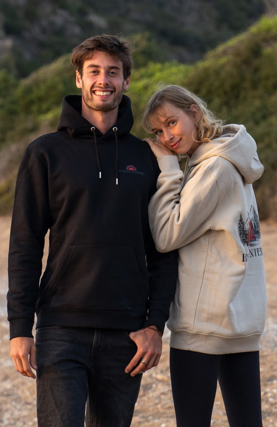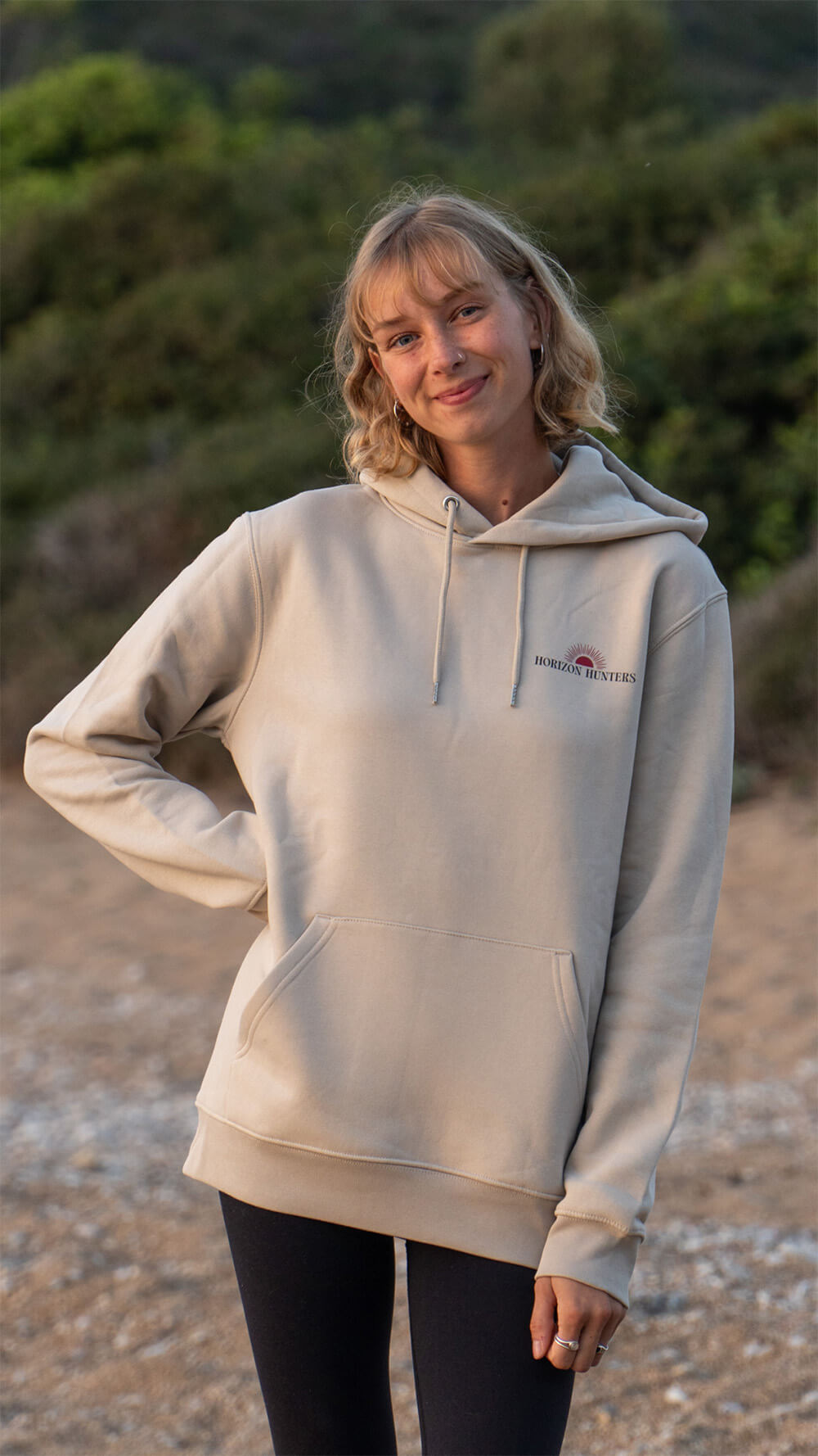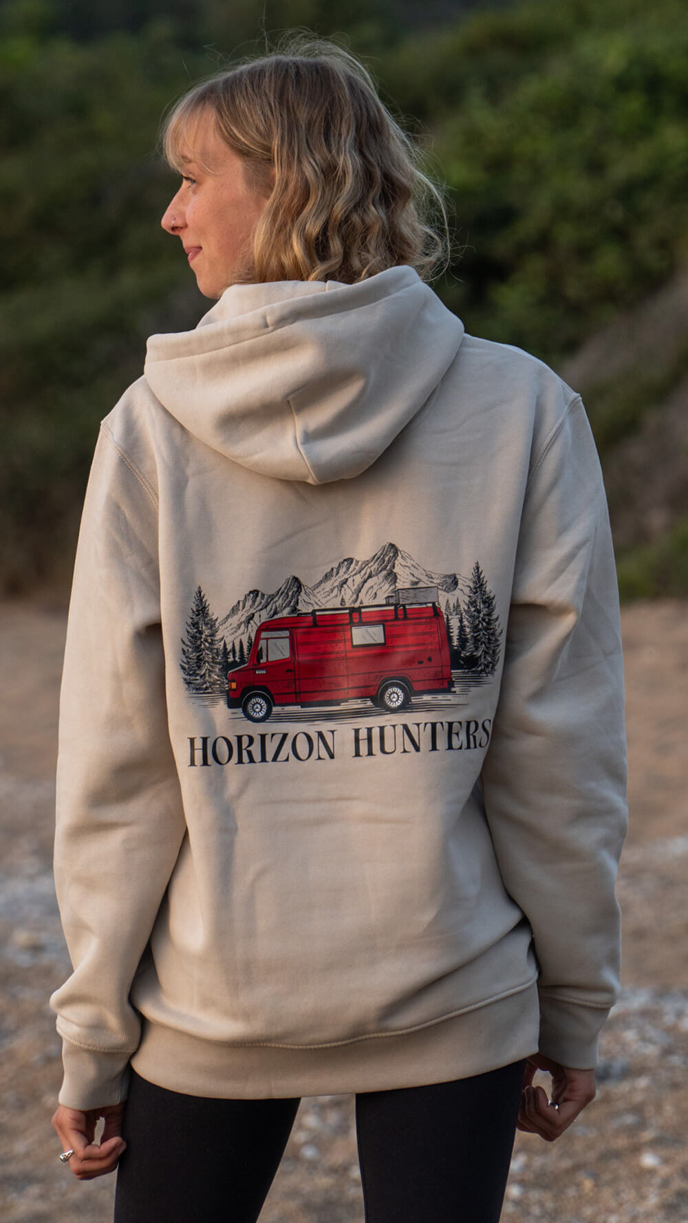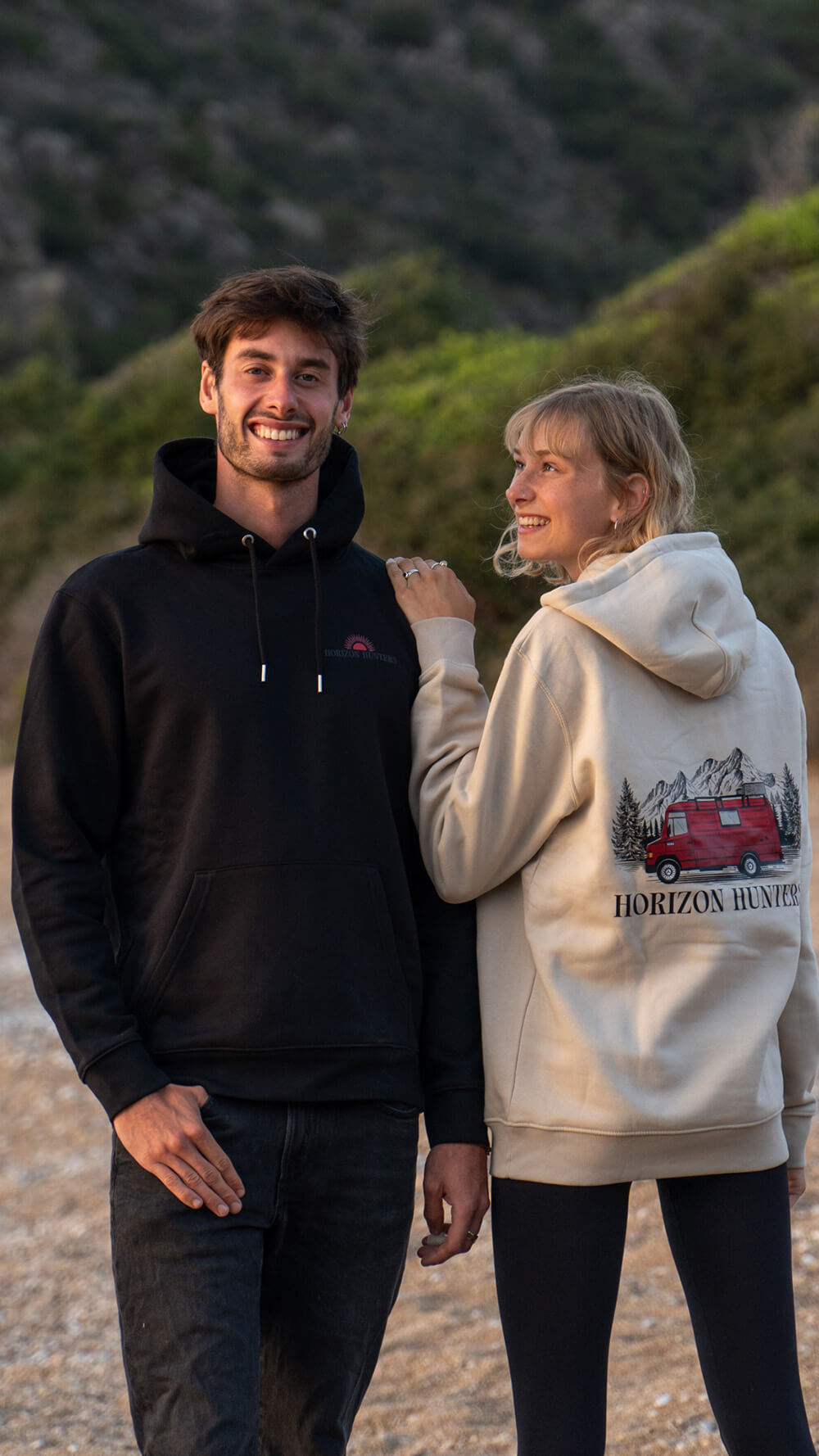 Hoodie in der Farbe "Black" und "Desert Dust" mit dem "Horizon Hunters" Aufdruck vorne, sowie hinten.