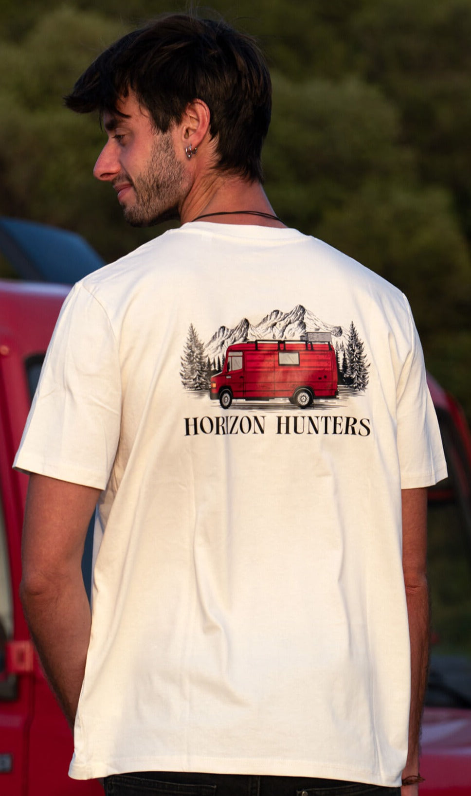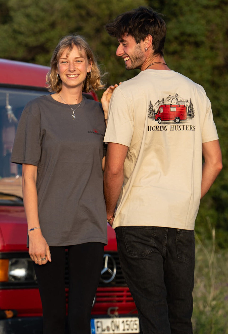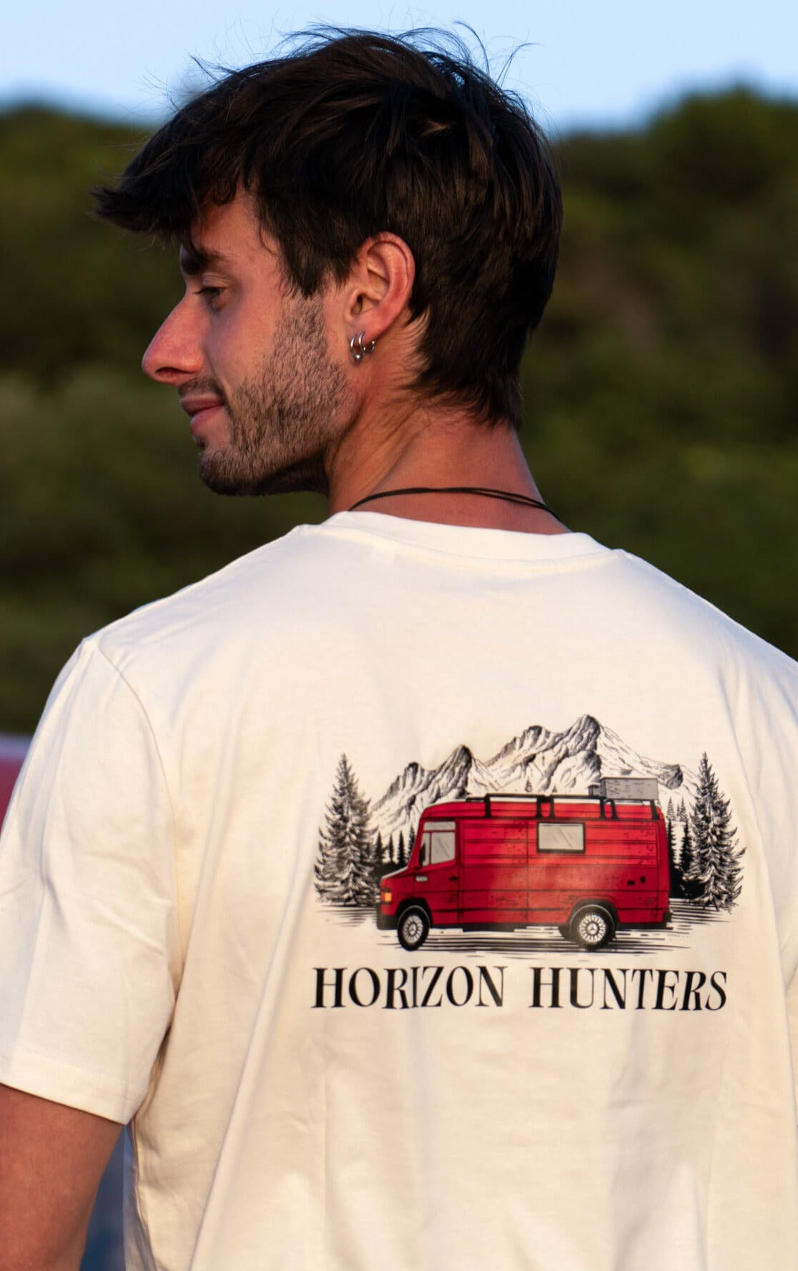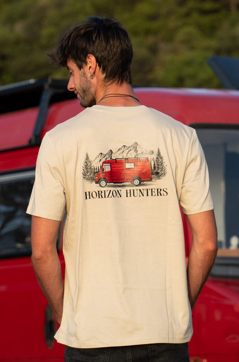 Shirts in der Farbe "Desert Dust", "Vintage White" und "Anthracite" mit dem "Horizon Hunters" Aufdruck vorne, sowie hinten.