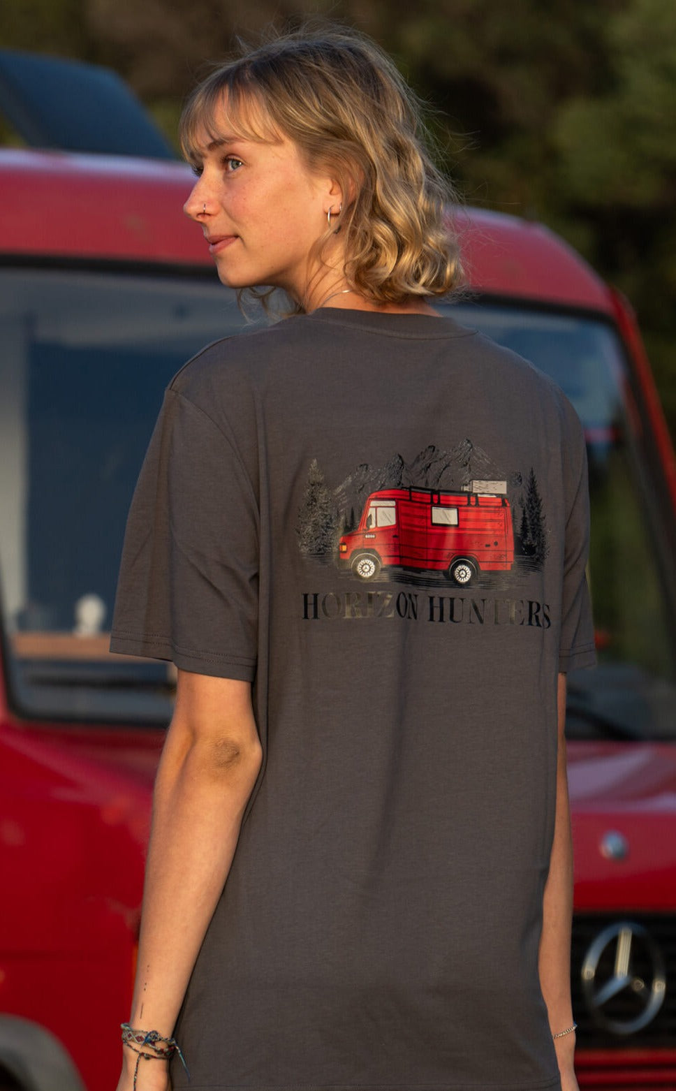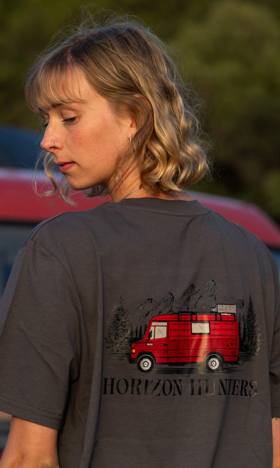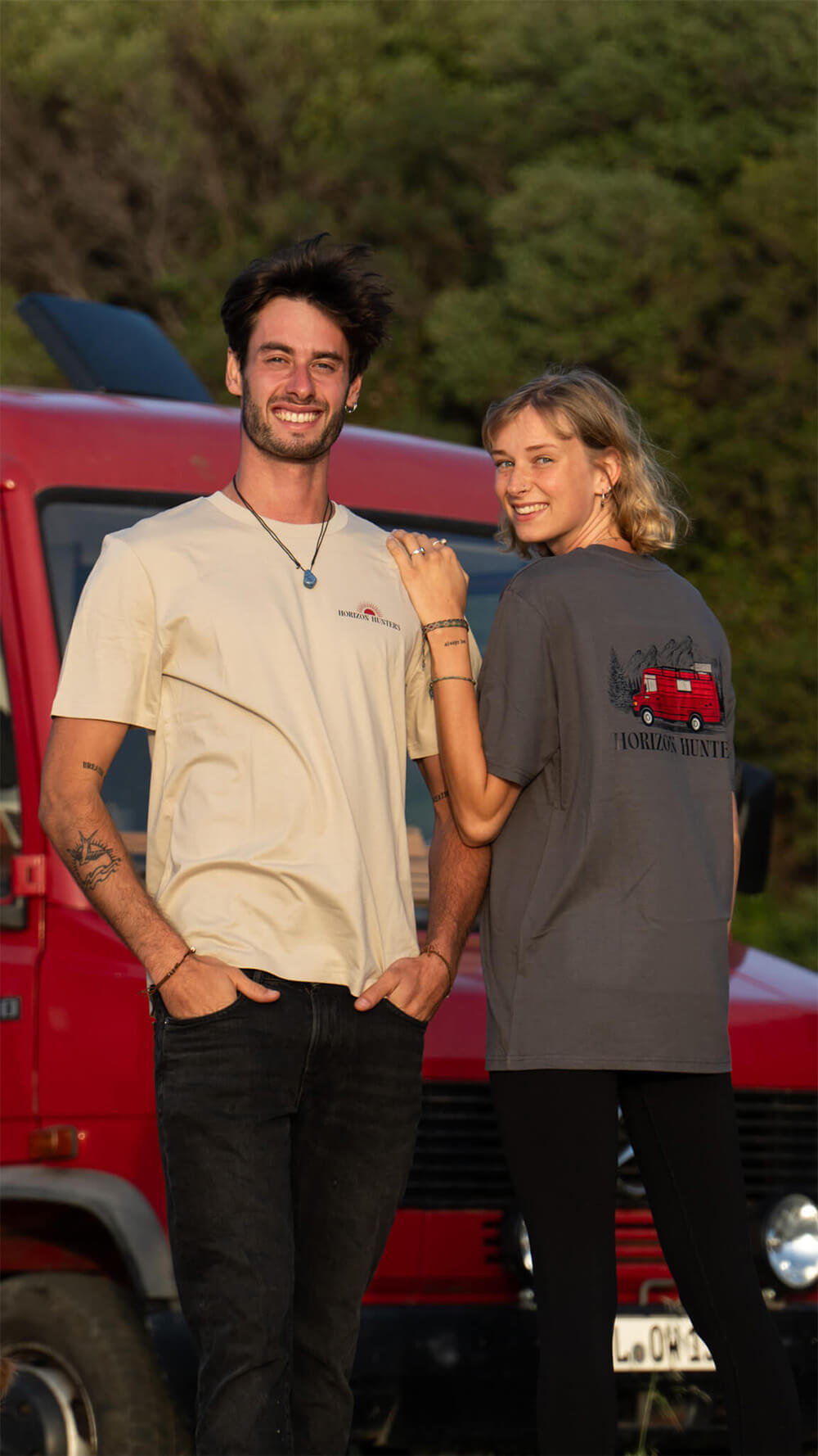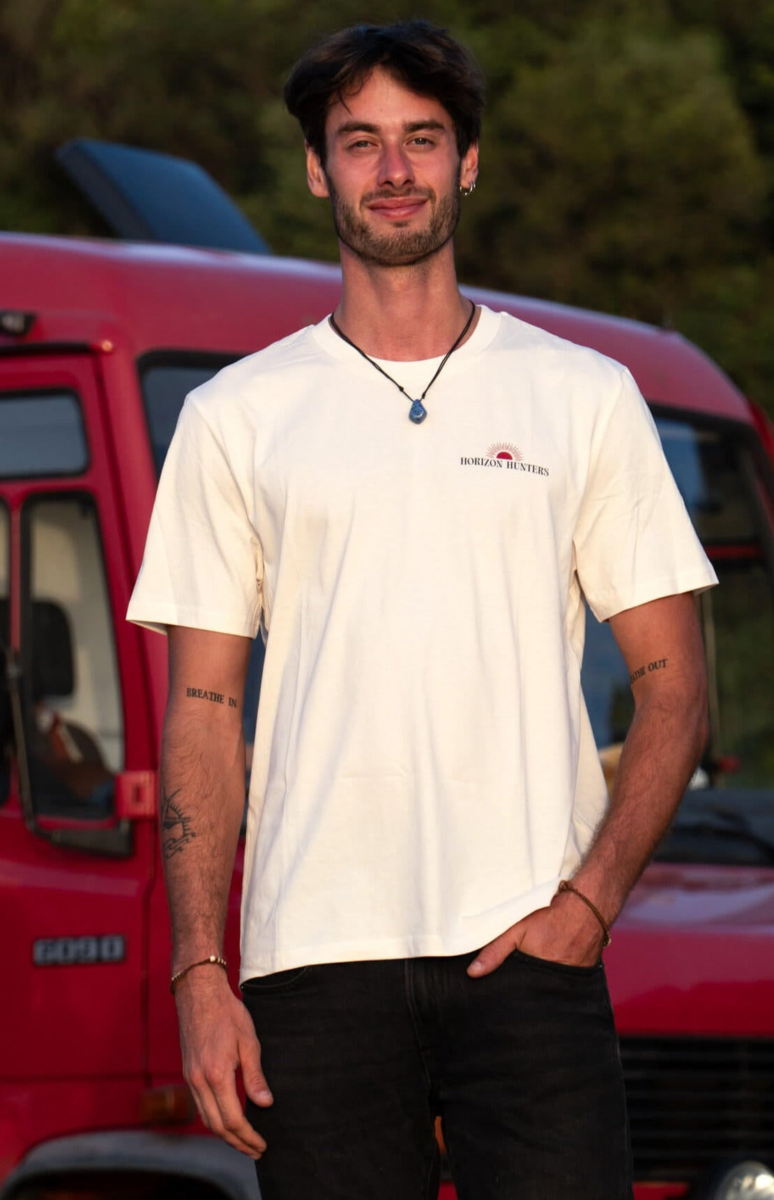 Shirts in der Farbe "Desert Dust", "Vintage White" und "Anthracite" mit dem "Horizon Hunters" Aufdruck vorne, sowie hinten.