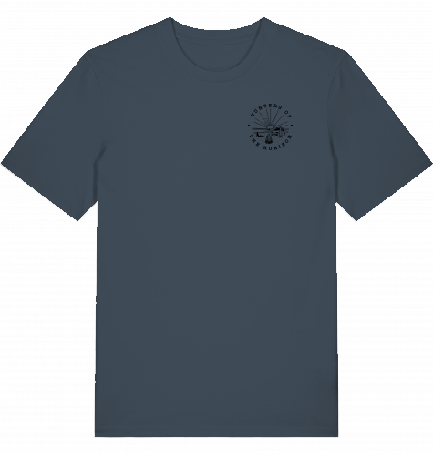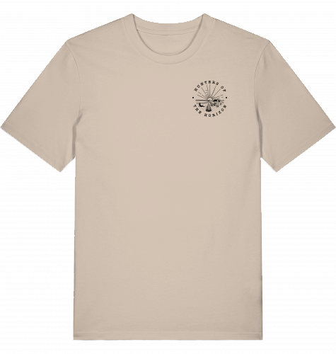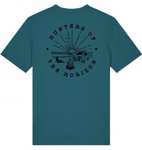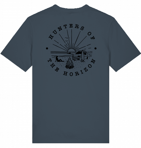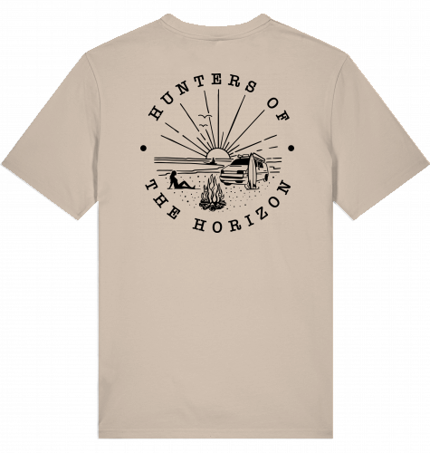 Shirts in der Farbe "Desert Dust", "Stargazer", "Vintage White" und "India Ink Grey" mit dem "Hunters of the Horizon BULLI" Aufdruck vorne, sowie hinten.